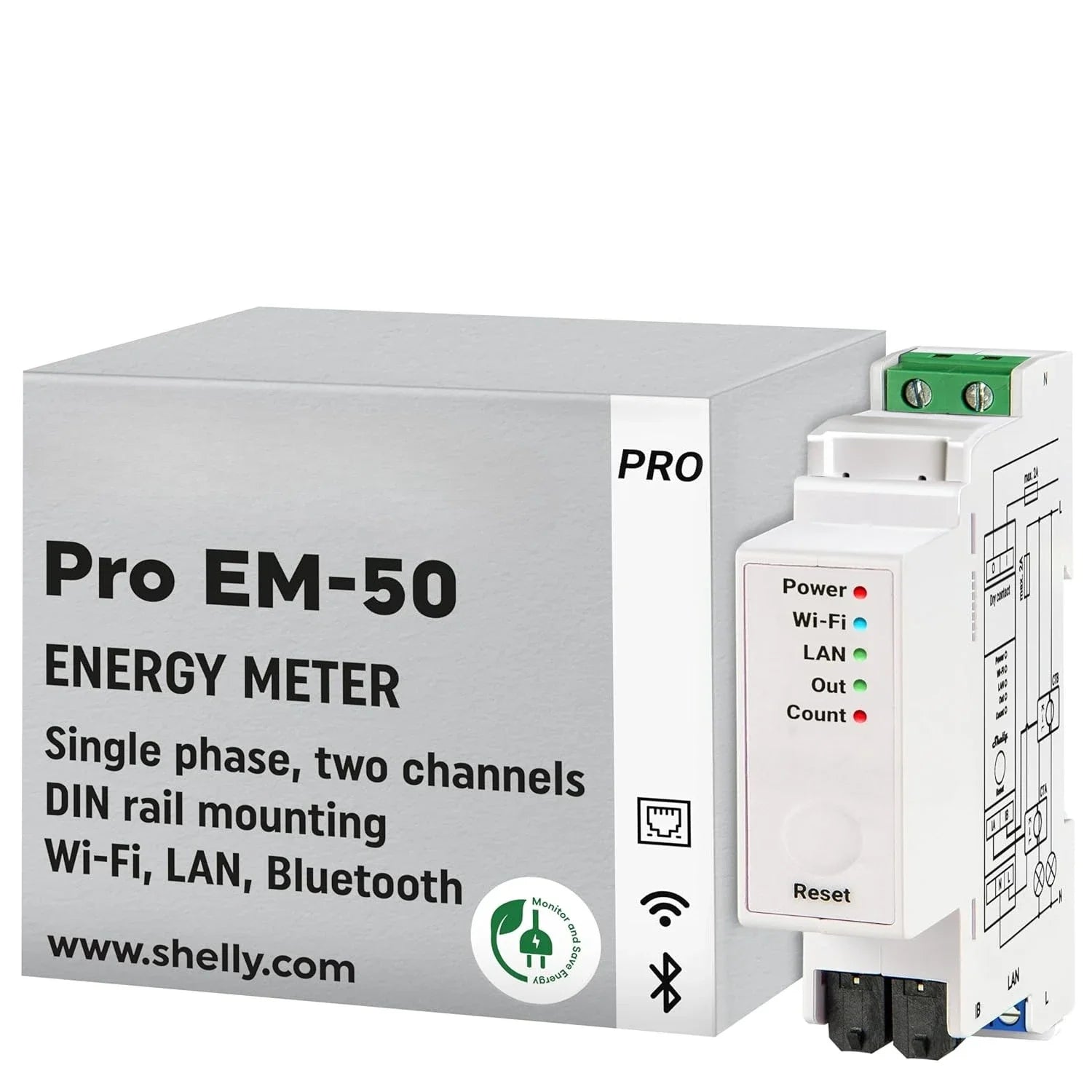 Pro EM 50A is a Wi-Fi energy meter with contactor control and LAN connectivity. Designed for DIN rail mounting, this single-phase, dual-channel energy meter comes with an integrated switch featuring potential-free contacts for precise contactor control. The package includes two 50A current transformers for accurate energy measurement. Additionally, it functions as a Bluetooth gateway, enhancing smart home integration and connectivity.